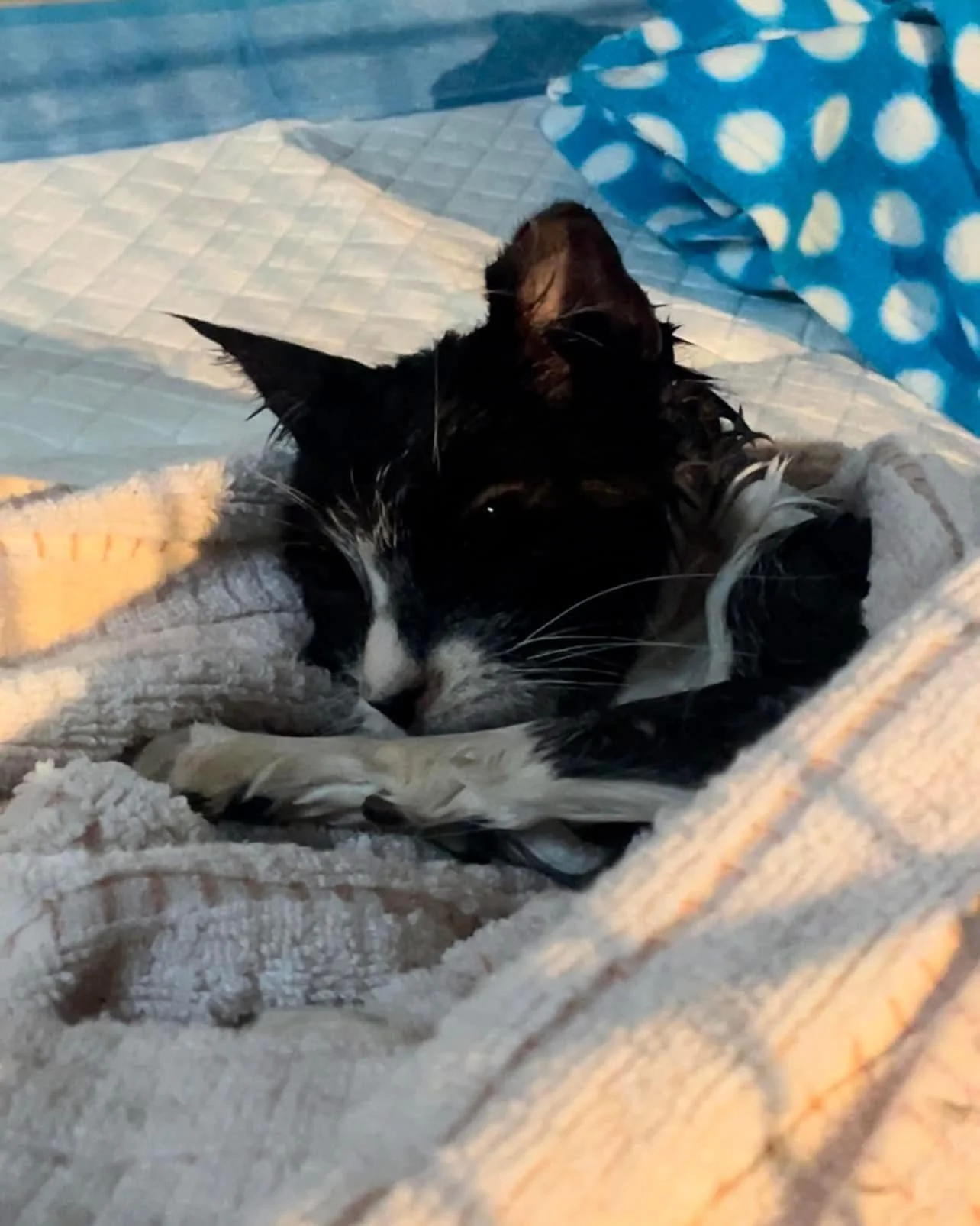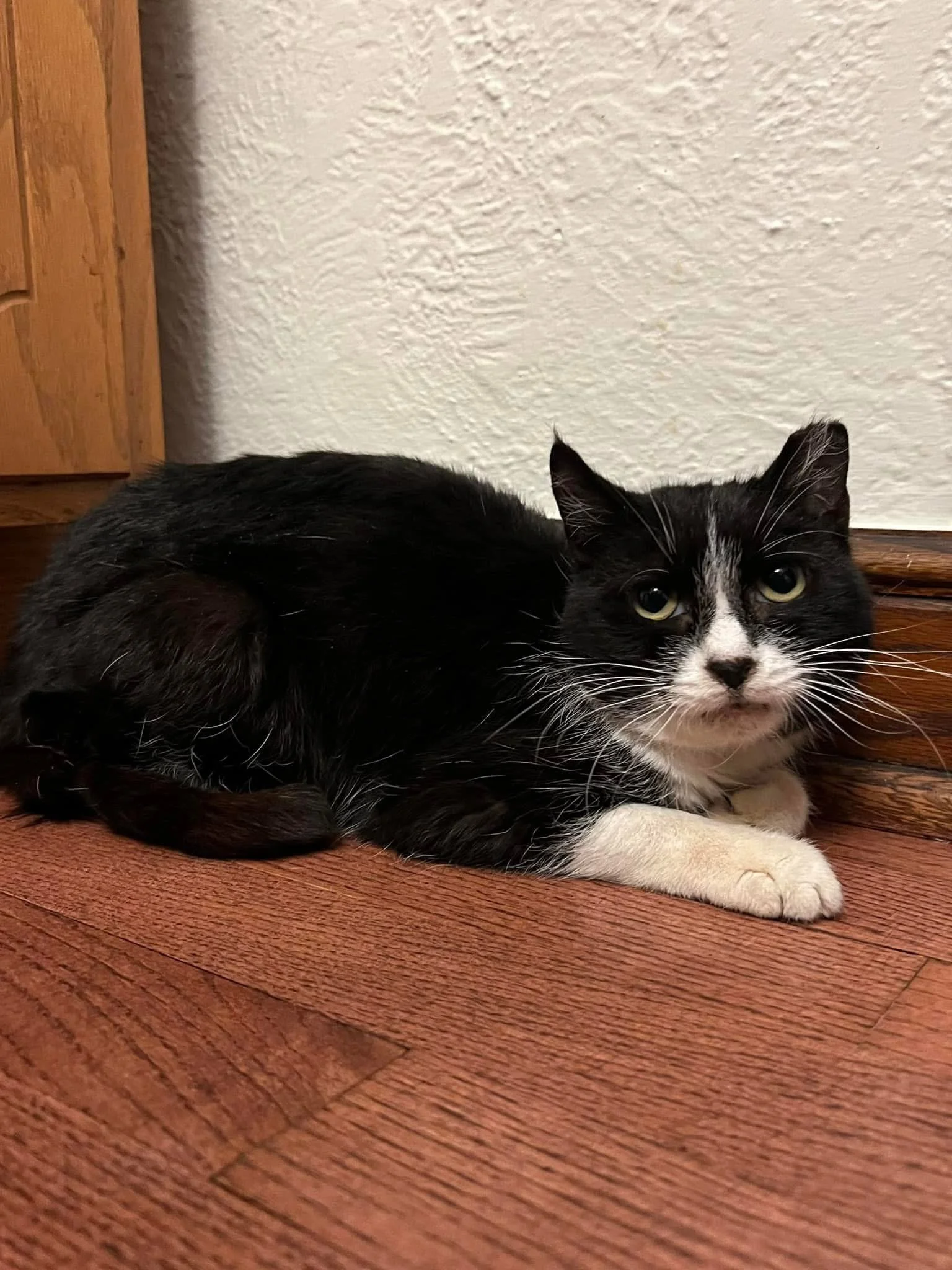 Monkey was a TNR cat that we released at our local colony. A few months later, we noticed she was not running away when we went to feed. She was quickly trapped, when we found her in terrible condition. She was skinny, freezing, and battling a severe infection. She weighed only 3 pounds! After weeks of treatment, she finally gained weight and made a full recovery. Monkey turned out to be the SWEETEST girl ever, and had the tiniest meow. She is full grown at only 6 pounds, and her adoptive family’s vet thought she was at least 11 years old! This poor girl was best friends with Leo and Swiss Roll, two other colony tom cats that we were able to find homes for.